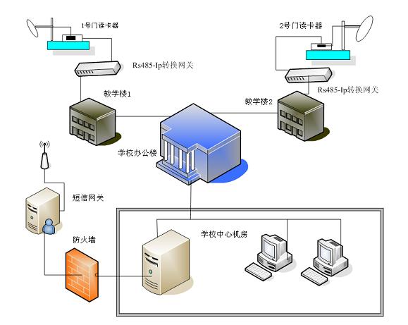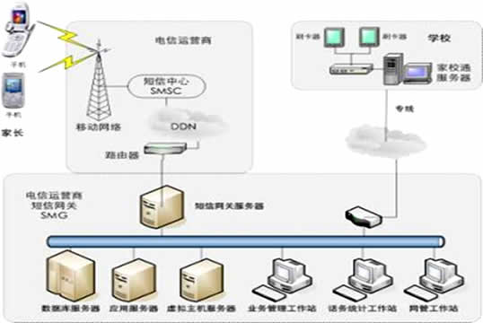 1. 通过无线短信模块设备或者移动运营商短信网关进行短信收发;在学校门口安装读卡器设备,连接家校通服务器,用于学生到校/ 离校刷卡,并自动触发家校通软件发送平安短信;